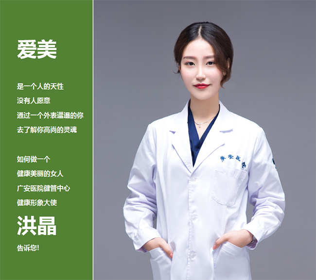 作為健管中心的健康形象大使,洪晶已經把健康與美麗,演繹成了一種精致的生活與品味。她認為:“精致、美麗、健康”是女人的追求,而廣安醫(yī)院能為女性客戶提供“健康+美麗”的整體解決方案,從健康評估、個性化體檢、中醫(yī)滋補調養(yǎng),到整形美容,一站式解決女性對健康和美麗的追求。
