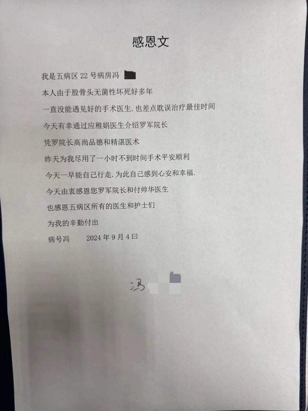 手術(shù)后12小時,患者便可以自己行走?;颊呒雀屑び指袆?,于9月4日送上感謝信,感謝羅軍副院長和五病區(qū)的所有醫(yī)護(hù)!
