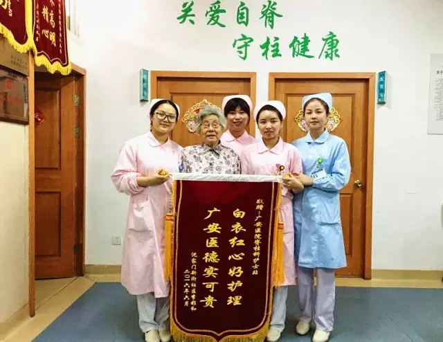 5月31日上午,廣安醫(yī)院脊柱科護(hù)士站收到一面錦旗,上面寫著:“白衣紅心好護(hù)理,廣安醫(yī)德實可貴”的字樣,送錦旗的是一位李阿姨。