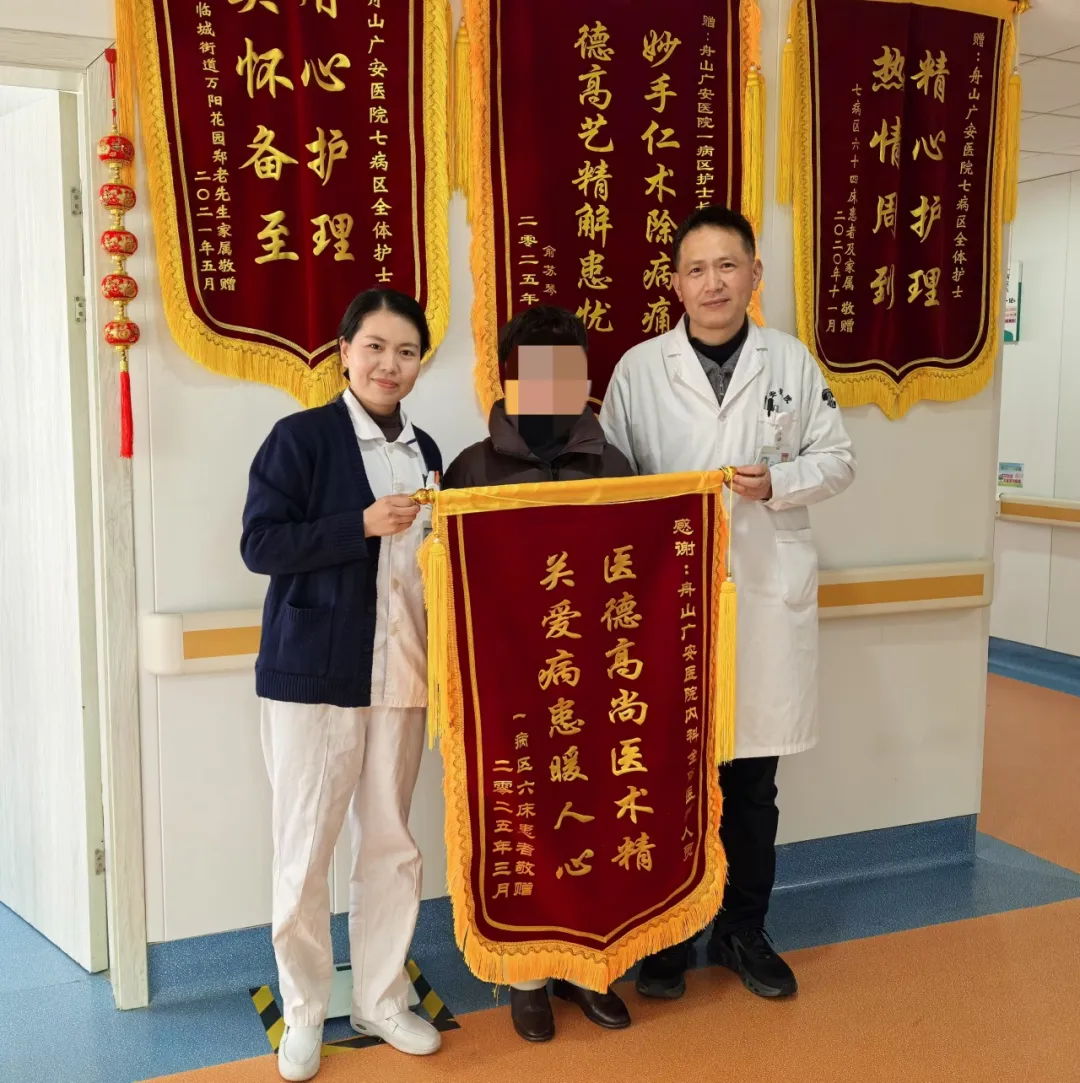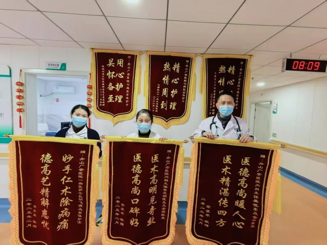 在內(nèi)科病區(qū)里,懸掛著眾多錦旗,總在無聲訴說著醫(yī)患間的溫情故事。近日,兩位與病魔抗?fàn)幎嗄甑睦先?,用紅綢金字的錦旗,為這個充滿愛心的醫(yī)療團(tuán)隊寫下最誠摯的注腳。