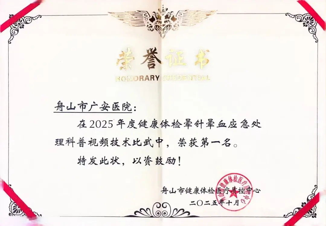 舟山廣安醫(yī)院相關(guān)負責(zé)人表示,本次獲獎是激勵更是責(zé)任。醫(yī)院將以此次比武為契機,進一步優(yōu)化暈針暈血應(yīng)急處理流程,把比武中積累的經(jīng)驗轉(zhuǎn)化為日常服務(wù)的實效,同時通過多元化科普形式普及應(yīng)急知識,持續(xù)踐行“以健康為中心,以質(zhì)量為核心”的服務(wù)宗旨,為市民提供更安全、優(yōu)質(zhì)的健康體檢服務(wù)。
