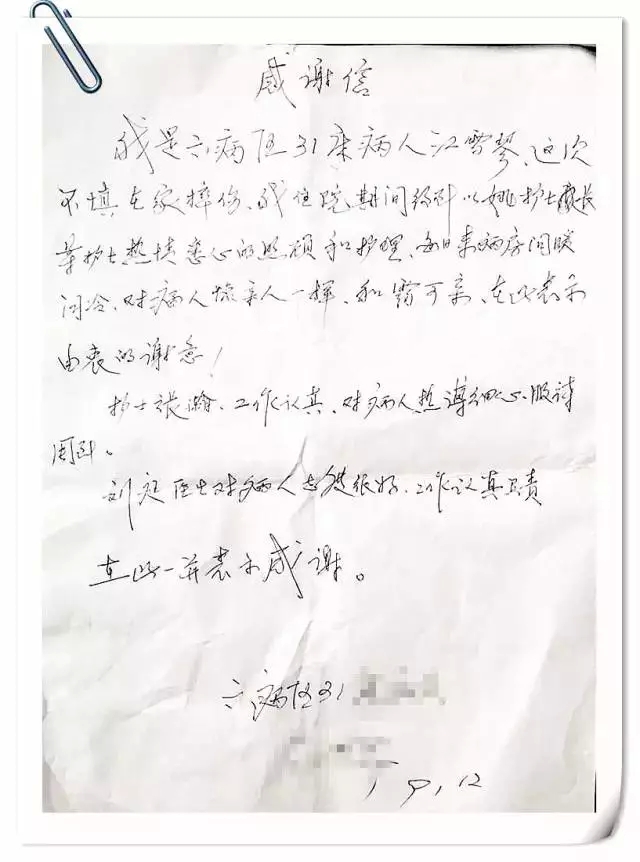 住院期間的這段時間,大家都知道江女士是個不善言辭的人??墒钦l也沒想到,這些日子的關(guān)心和照顧,讓她內(nèi)心十分感激,還寫了一封感謝信。信雖簡短,但字字有力,字里行間充滿了她對醫(yī)護人員工作的肯定。