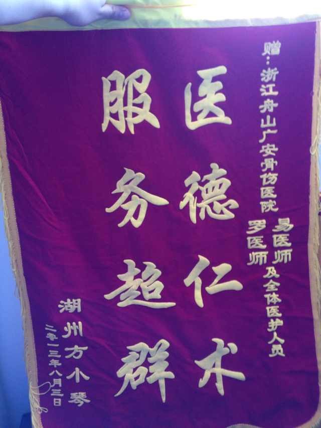 今年8月,時隔手術(shù)時間已經(jīng)一年了,方女士千里迢迢從湖州再次趕來我院,為的只是進行內(nèi)固定拆除術(shù)。其實拆除手術(shù),是一個很簡單的手術(shù),在普通醫(yī)院都能完成??沙鲇趯ξ以旱男湃魏透屑?,方女士特地讓兒子開車從湖州趕到舟山。手術(shù)結(jié)束后,方女士顯得激動萬分。她說:感謝廣安醫(yī)院醫(yī)生護士的高超技術(shù)以及細心照顧,讓我的腿恢復(fù)的這么好。雖然湖州離舟山要好幾個小時的車程,可是我不覺得辛苦,因為我知道這里有最好的醫(yī)生護士等著我,我對他們的技術(shù)與服務(wù)感到非常的放心。這面錦旗不值錢,可卻代表了我對廣安醫(yī)院的感激之情。