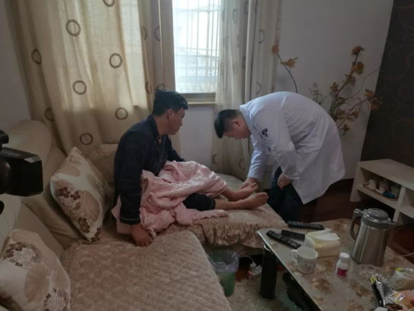 “這里還痛不痛?”“出院之后有沒有堅(jiān)持康復(fù)鍛煉?” 易觀俊一邊查看鐘老伯的患肢,一邊詢問他的康復(fù)情況,并交代了康復(fù)的注意事項(xiàng)。