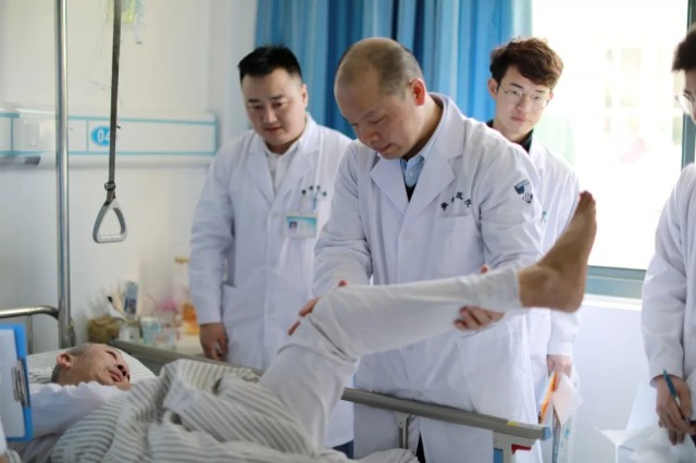 3月16日,上海六院關(guān)節(jié)科蔣垚教授查房,和廣安醫(yī)護人員一起探討患者病情