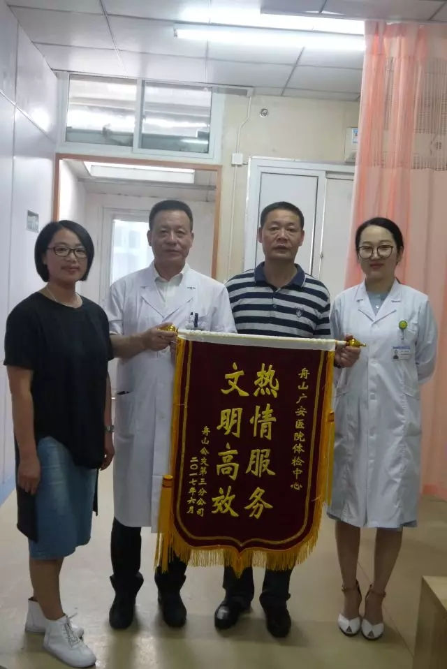 6月28日,普陀公交三公司領導親自將一面錦旗送到廣安醫(yī)院院長郭維杰的手中,錦旗上書:“熱情服務 文明高效”,以感謝廣安體檢中心為其公司員工進行全面細致的體檢。該公司員工盛贊體檢工作安排得細致周到,體檢方案完善全面,醫(yī)生醫(yī)術精湛,工作人員服務熱情,早餐安排營養(yǎng)豐盛。