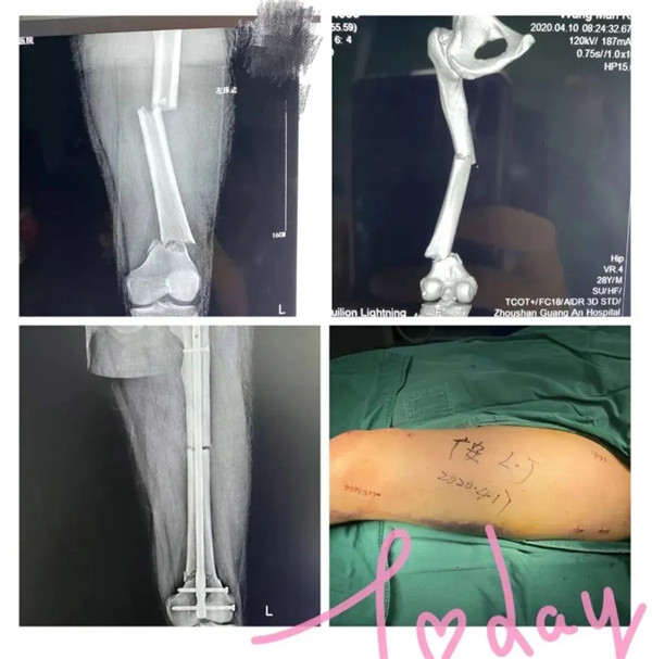 受傷的是家住城北的年輕小伙小王,早上騎電動(dòng)車去上班速度太快而不慎摔傷。急診醫(yī)生初步檢查,判斷是大腿骨骨折,立即予以拍片檢查。結(jié)果顯示:左股骨多段粉碎性骨折。小王左腿股骨竟斷成三截 !須做手術(shù)治療。病人和家屬看到片子后,都有點(diǎn)嚇傻了,急得語無倫次,不斷地追問醫(yī)生:“醫(yī)生,這該怎么辦呢?骨頭都斷這樣了,還能接好嗎?……”醫(yī)生趕緊安撫病人和家屬:“到了我們醫(yī)院,您們放心好了。等檢查完善后,我們會(huì)盡快施行手術(shù)治療的”。小王當(dāng)即辦理了住院手續(xù)。