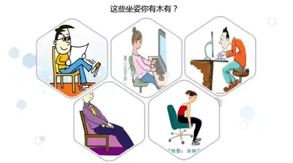 行走坐立時應(yīng)保持姿勢端正,不要弓腰、駝背、蹺二郎腿等等不良姿勢;長期低頭看手機(jī)或伏案工作的人,最好每半個小時休息活動一下。