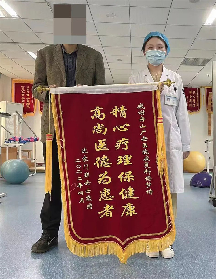 4月29日,患者鄭阿姨的老伴來到我醫(yī)院,將飽含誠摯謝意寫有“精心療理保健康、高尚醫(yī)德為患者”的錦旗贈予康復(fù)中心治療師傅夢詩手中,表達(dá)對康復(fù)中心治療師傅夢詩的感激之情。