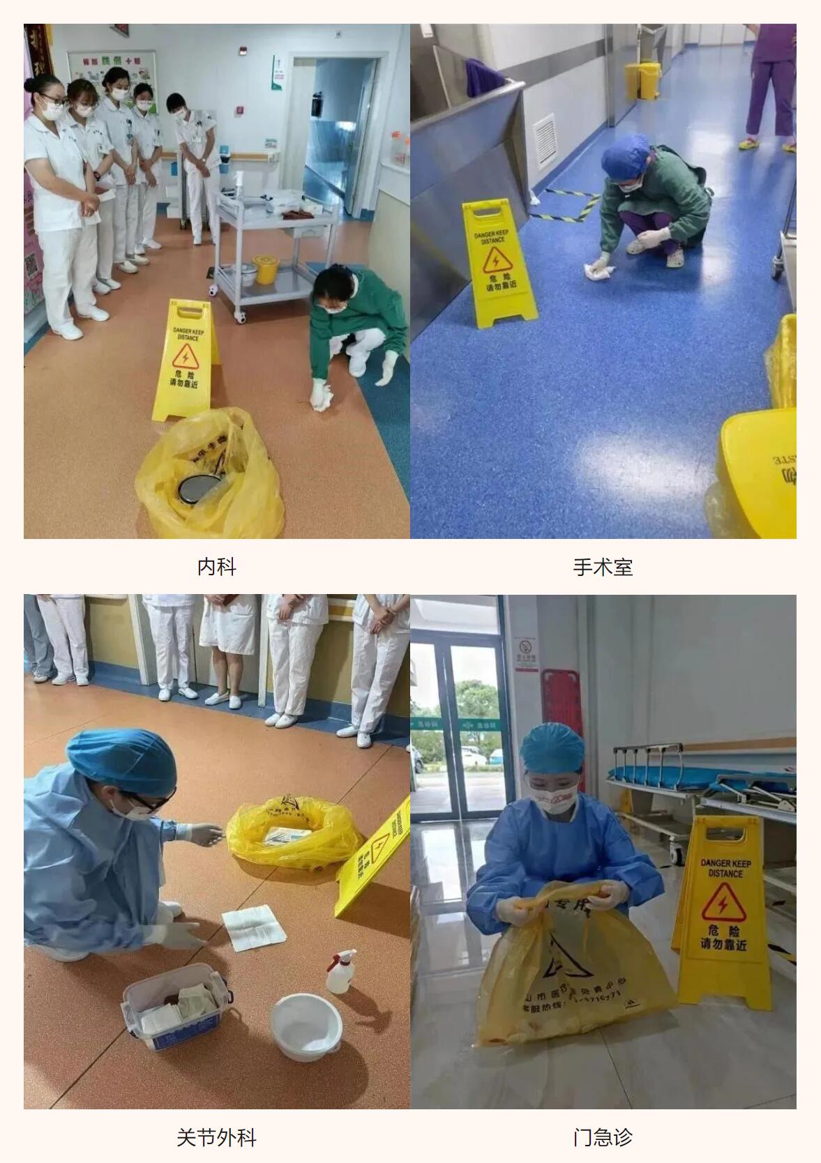 為了妥善處理這類比較常見的突發(fā)事件,進一步提高我院醫(yī)務人員對血液、體液濺灑地面的應急處理能力,最大限度降低污染造成的危害,保障醫(yī)療安全,8月24日,感染管理科、護理部聯(lián)合各臨床及相關重點科室組織開展了血液、體液濺灑意外事件應急處置演練。