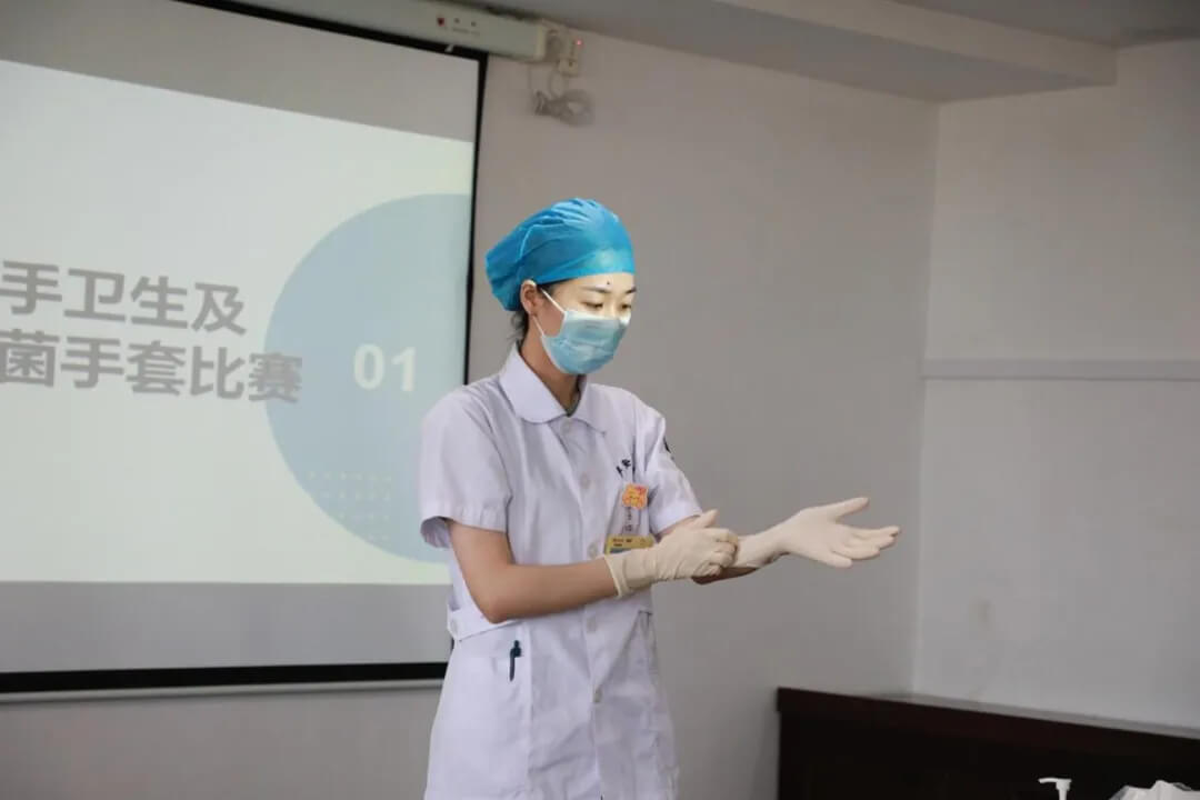 本次活動涵蓋了衛(wèi)生手消毒操作演示與競賽、戴無菌手套規(guī)范操作比拼以及保潔阿姨醫(yī)廢鵝頸結(jié)封口比賽等多個項目。