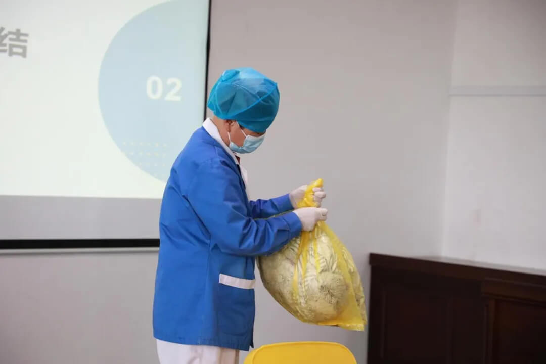 保潔阿姨們參與的醫(yī)廢鵝頸結(jié)封口比賽更是將活動推向了高潮。保潔阿姨們個個精神飽滿,動作利落,熟練地將醫(yī)療廢物袋進(jìn)行鵝頸結(jié)封口處理。這一比賽項目不僅增強(qiáng)了保潔人員對醫(yī)療廢物規(guī)范處理的意識,也進(jìn)一步提升了她們的實際操作能力,為醫(yī)院感染防控工作提供了有力保障。