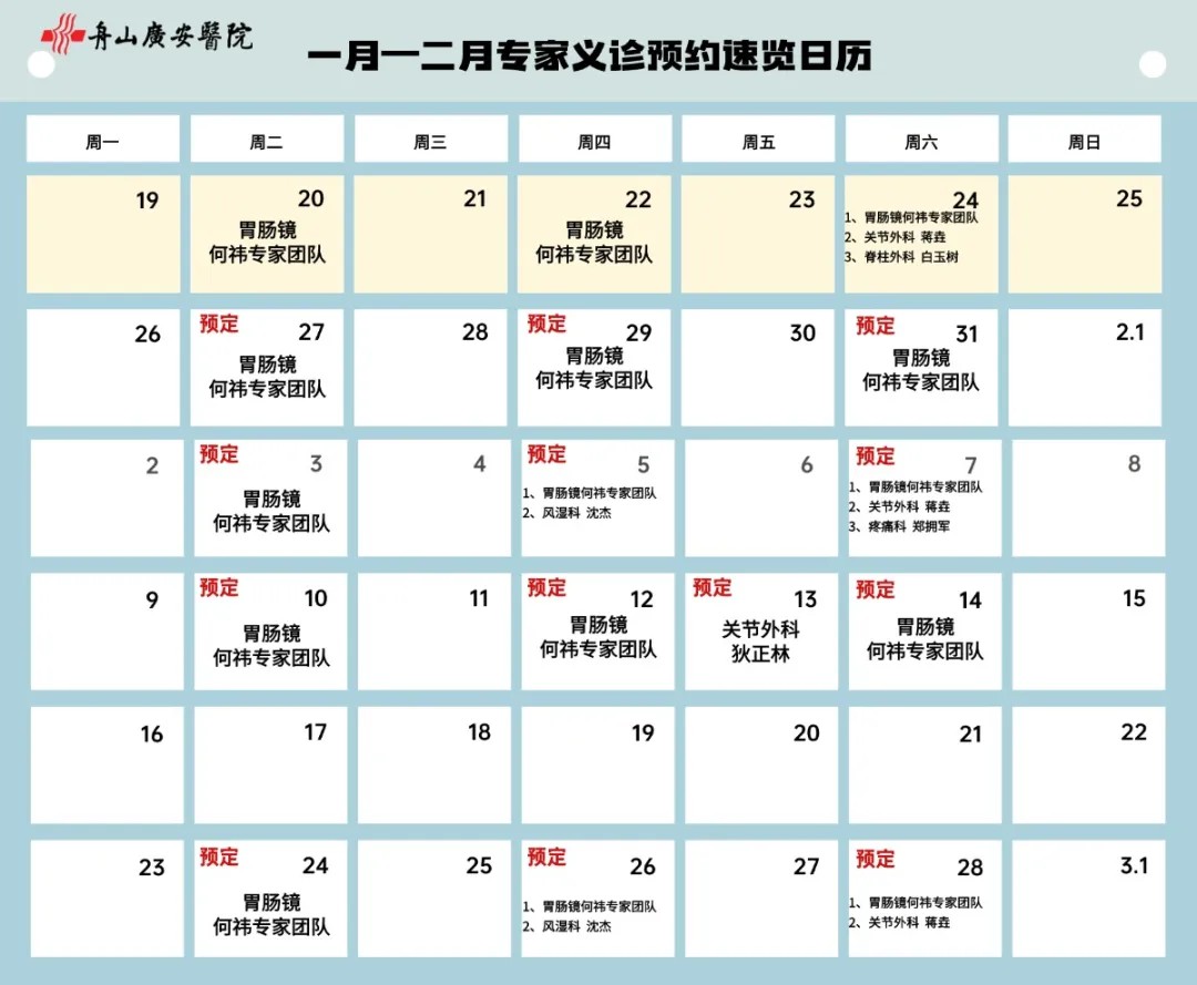 每月專家義診預(yù)約速覽日歷