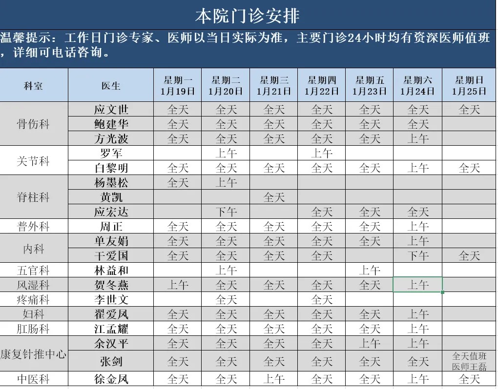 1月19日—1月25日本院門診安排表