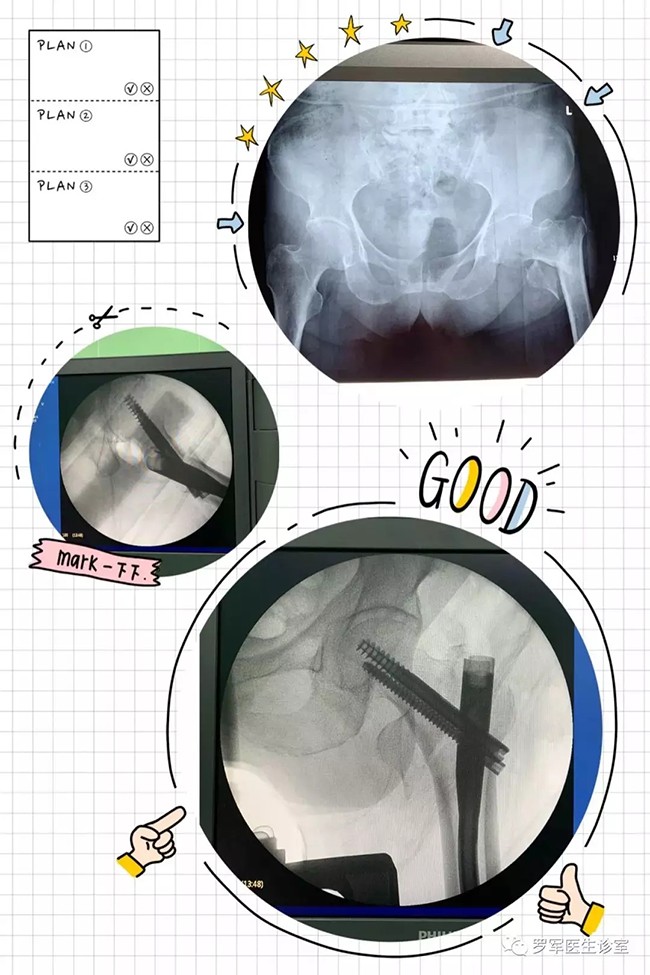 5月7日,羅軍主任帶領(lǐng)手術(shù)團(tuán)隊(duì)按照術(shù)前的討論方案,在C臂機(jī)透視下,采用三個微創(chuàng)手術(shù)通道,施行精準(zhǔn)閉合復(fù)位、定位、固定,僅用了大約30分鐘,便成功完成微創(chuàng)內(nèi)固定手術(shù)。手術(shù)進(jìn)行順利,第二天老人就可以在床邊坐起了。老奶奶非常開心,叫家人一定要送面錦旗給醫(yī)生。