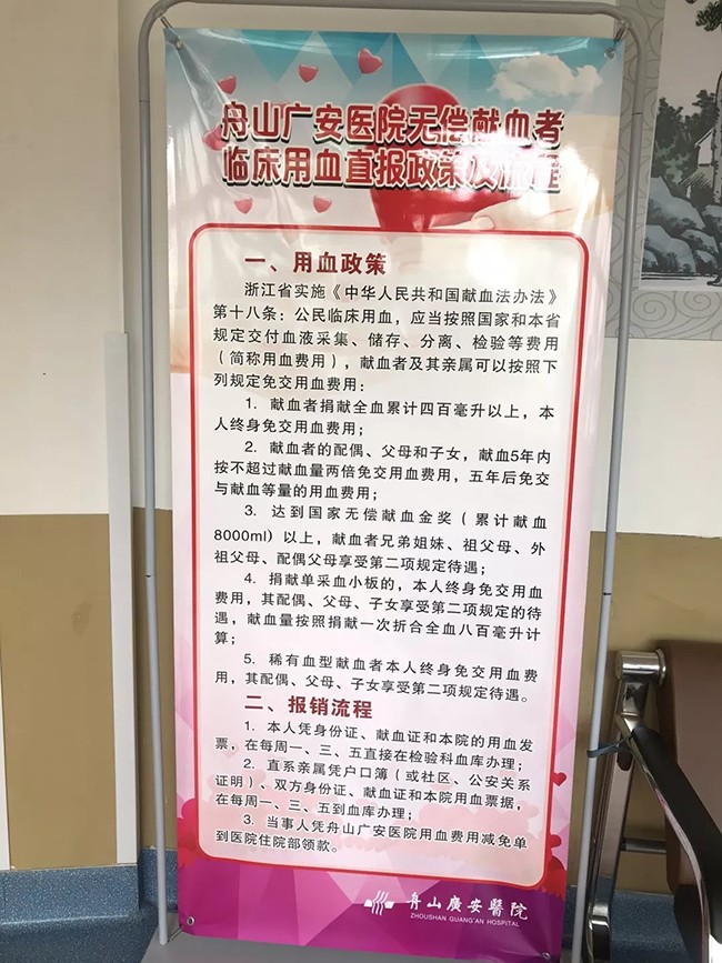 無償獻血者免費用血報賬不需要再東奔西跑,在就診醫(yī)院即可一站式報銷,這一政策在舟山廣安醫(yī)院已不折不扣執(zhí)行了7年,到目前為止,廣安醫(yī)院依舊是全市唯一一家實行血庫直報業(yè)務的民營醫(yī)院。