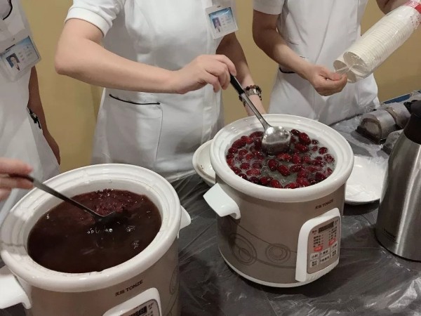 為了讓參加獻(xiàn)血的人能及時(shí)得到營養(yǎng)補(bǔ)充,醫(yī)院為奉獻(xiàn)愛心的醫(yī)務(wù)人員精心準(zhǔn)備了紅棗湯、紅豆粥、小甜品等補(bǔ)給食物,為活動保駕護(hù)航。