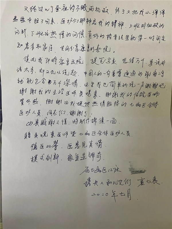 8月17日上午,在辦完所有的出院手續(xù)后,張大爺握著醫(yī)生護(hù)士的手,激動(dòng)的心情溢于言表。當(dāng)他把一封手寫(xiě)的感謝信與錦旗交到醫(yī)生手中的時(shí)候,在場(chǎng)的所有醫(yī)生也覺(jué)得非常感動(dòng)。