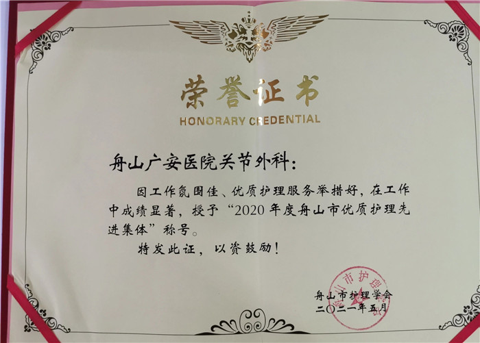 經(jīng)舟山市衛(wèi)健委、舟山市護理學(xué)會評定,我院關(guān)節(jié)外科在護士長劉燕的帶領(lǐng)下,憑借扎實的理論基礎(chǔ)、高超的護理技術(shù)、嚴(yán)謹?shù)穆殬I(yè)操守、人性化的服務(wù)理念被評選為“2020年度舟山市優(yōu)質(zhì)護理先進集體”。