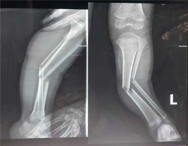 經(jīng)拍片顯示,睿睿左脛腓骨中段粉碎性骨折。接診的我院骨科中心主任羅軍建議其入院接受手術(shù)治療。