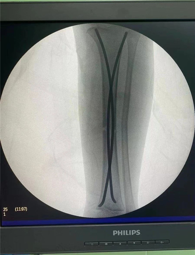 據(jù)羅主任介紹,兒童骨折絕不是成人骨折的縮小版。兒童的不穩(wěn)定性脛骨骨折或雙側(cè)脛骨骨折,保守治療很難達(dá)到理想復(fù)位,可能會(huì)造成肢體不等長(zhǎng)、成角旋轉(zhuǎn)畸形、肌肉萎縮等并發(fā)癥。而彈性髓內(nèi)釘?shù)膽?yīng)用,正好解決了患者和醫(yī)生所擔(dān)心的問(wèn)題,既理想地固定了骨折,又不影響肢體美觀,可謂一舉兩得。“彈性髓內(nèi)釘”技術(shù)可在保護(hù)骺板不受損傷的前提下,利用多點(diǎn)固定的原理,微創(chuàng)、有效地治療3—15歲的四肢長(zhǎng)骨骨折患兒。手術(shù)在C型臂全程引導(dǎo)下,只需在骨折遠(yuǎn)、近端各切一2—3cm切口打入彈性髓內(nèi)釘,創(chuàng)傷極小,不影響孩子的骨骼發(fā)育,對(duì)于骨折的愈合以及孩子以后骨骼發(fā)育影響小。相比之下,既有效避免了切開(kāi)復(fù)位鋼板內(nèi)固定創(chuàng)傷大、疤痕大等缺點(diǎn),又有效避免了支架外固定鋼針外露、不易護(hù)理等弊端。