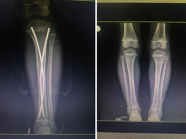 在接下來(lái)的康復(fù)過(guò)程中,睿睿非常配合,恢復(fù)的非常好。今年4月12日,睿睿拆除了左腿里的彈性釘。