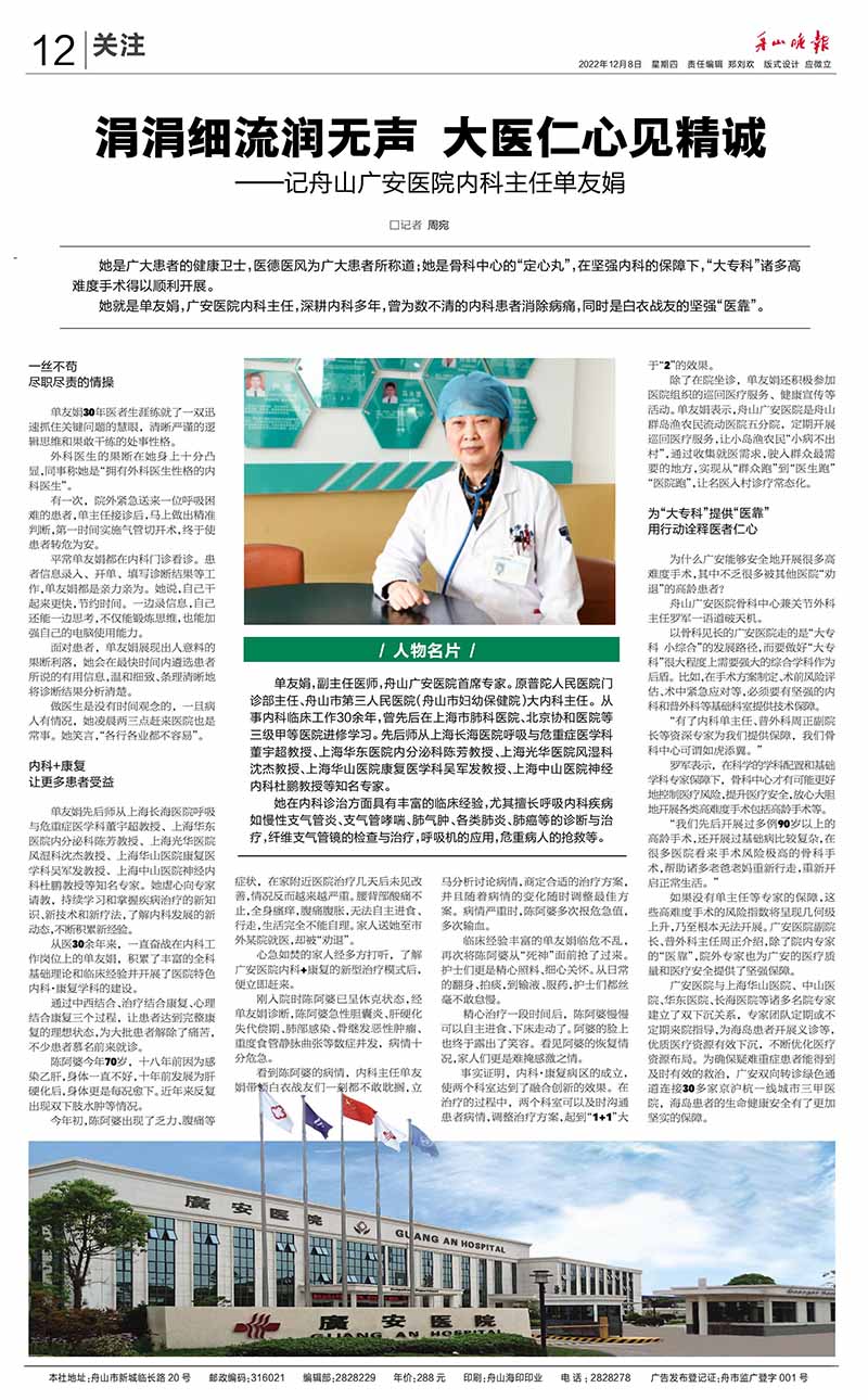 廣安人懷揣著對(duì)于醫(yī)療的敬畏和對(duì)舟山人的大愛,將以更加昂揚(yáng)的姿態(tài)和海納百川的胸懷,不斷把學(xué)科建設(shè)和醫(yī)療技術(shù)水平推向更高的境界,服務(wù)舟山、造福社會(huì)。