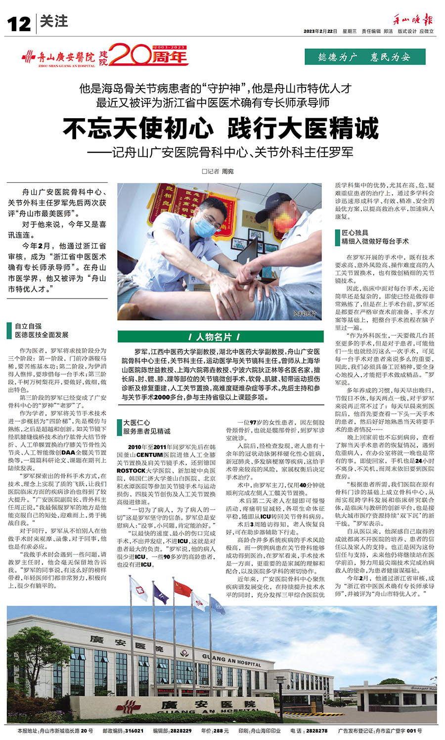 廣安人懷揣著對于醫(yī)療的敬畏和對舟山人的大愛,將以更加昂揚(yáng)的姿態(tài)和海納百川的胸懷,不斷把學(xué)科建設(shè)和醫(yī)療技術(shù)水平推向更高的境界,服務(wù)舟山、造福社會。