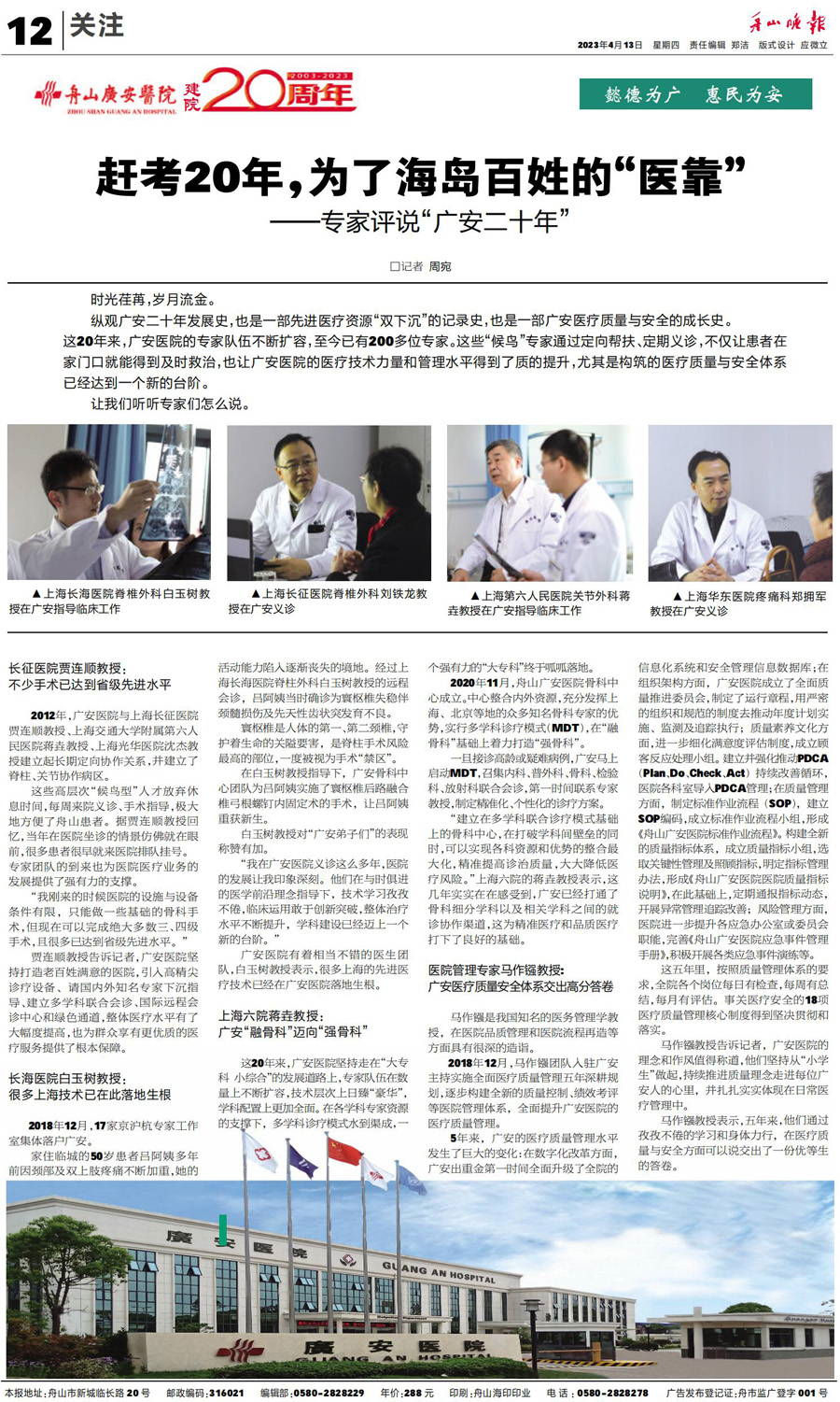 廣安人懷揣著對于醫(yī)療的敬畏和對舟山人的大愛,將以更加昂揚的姿態(tài)和海納百川的胸懷,不斷把學(xué)科建設(shè)和醫(yī)療技術(shù)水平推向更高的境界,服務(wù)舟山、造福社會。